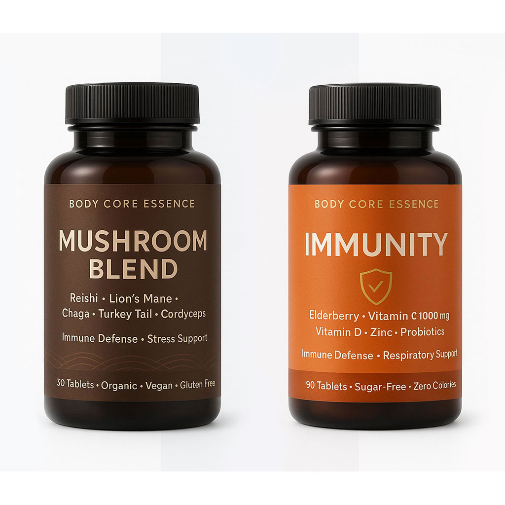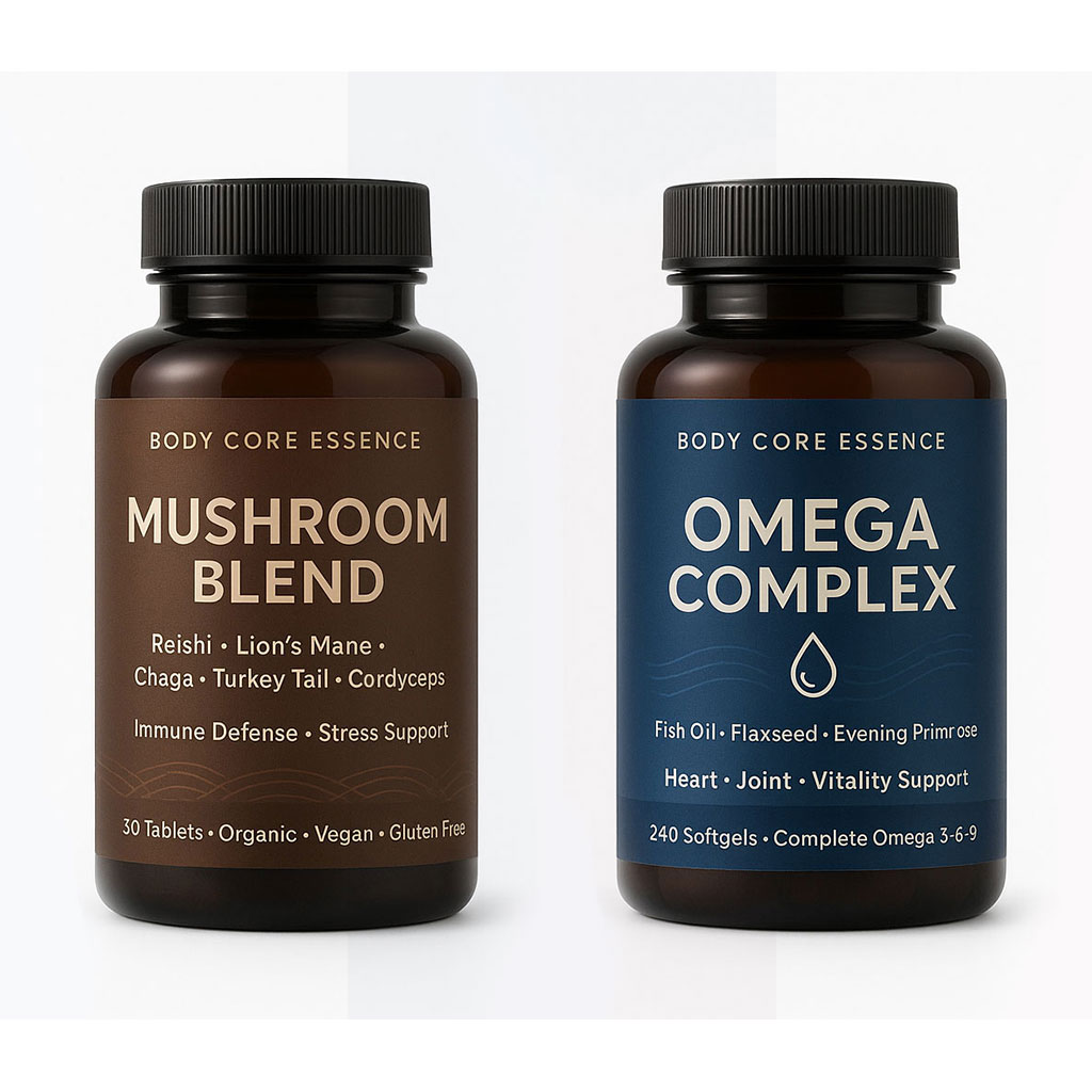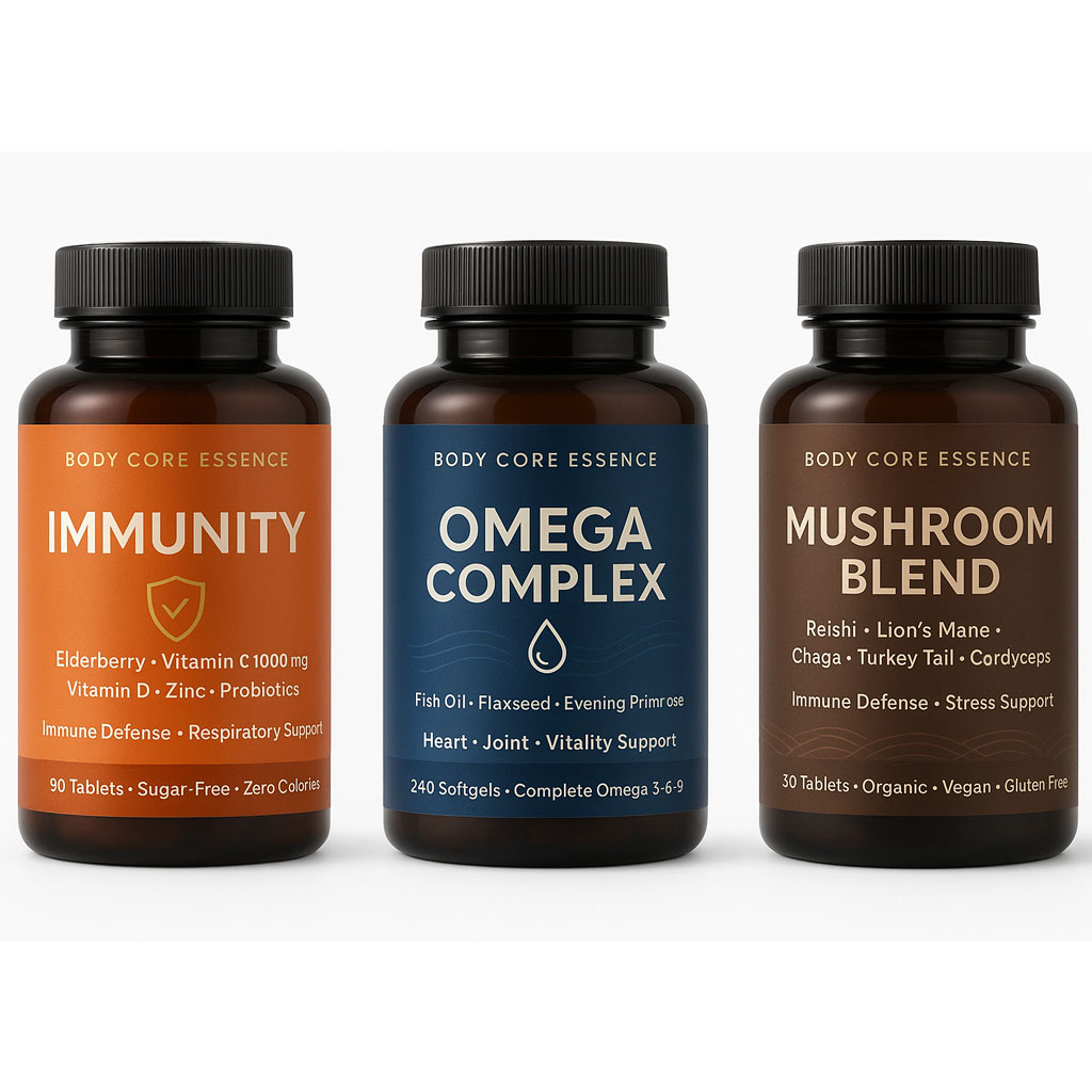 The Body Core Essence Wellness Trio combines Immunity, Omega Complex, and Mushroom Blend into a single daily system